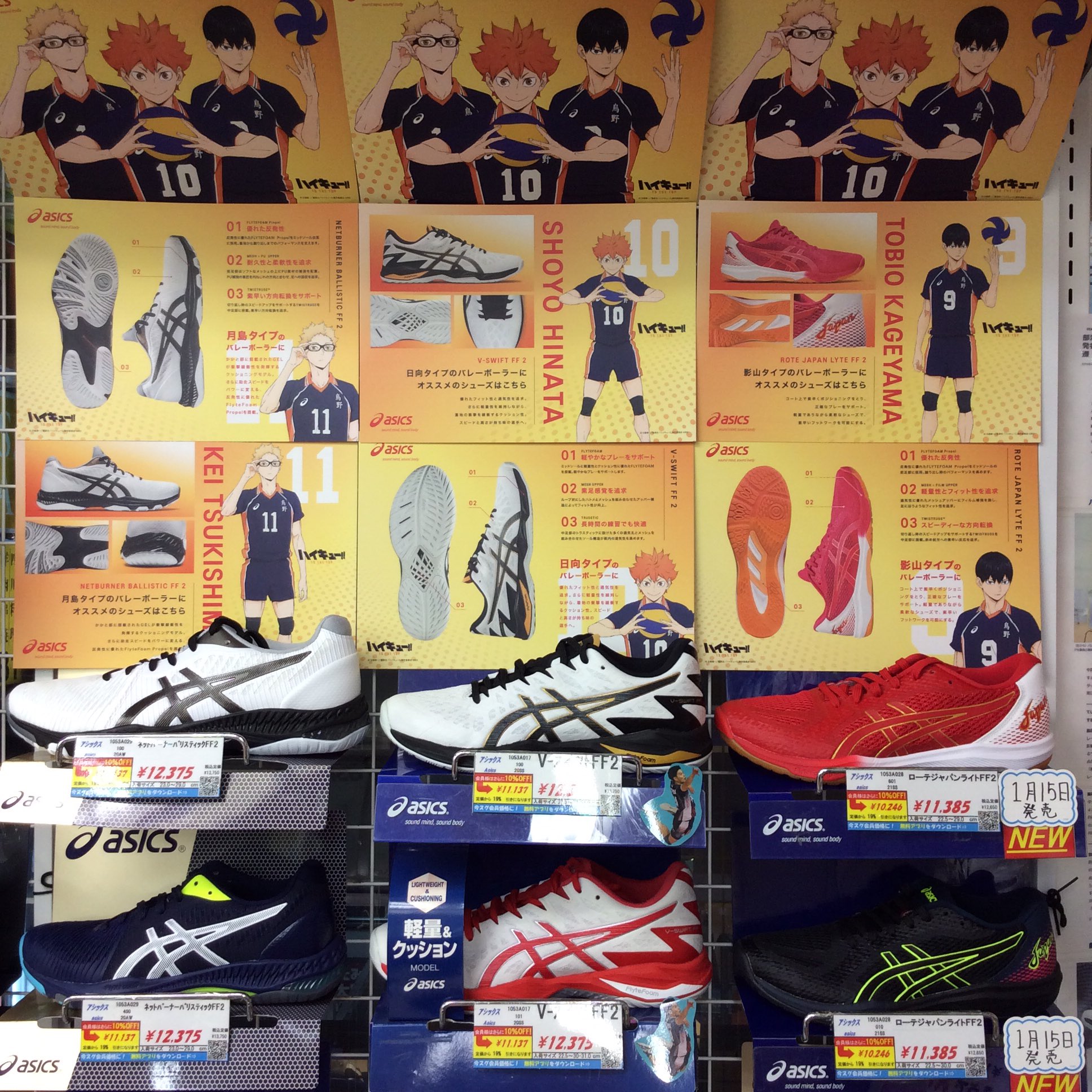 スポーツジュエン本店バレーボール ハイキュー アシックスのコラボpop飾りました 日向 影山 月島の3人が アシックスの シューズを解説してくれてます シューズの特徴を知ると選ぶのが楽しくなるかも ハイキュー 日向翔陽 影山飛雄 月島蛍