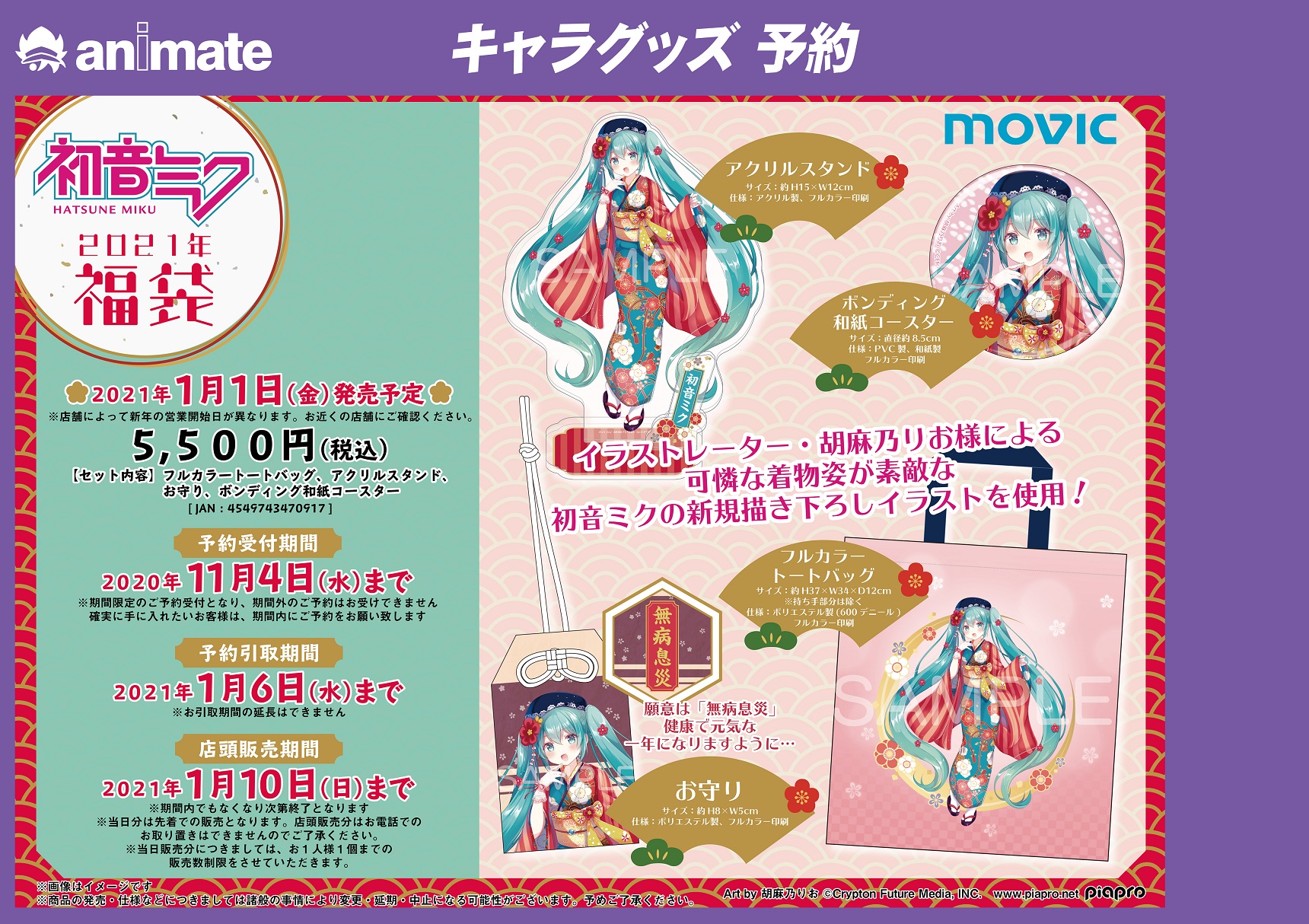 株式会社アニメイト 初音ミクシリーズ 福袋 21年 が予約受付中 イラストレーター 胡麻乃りお様 による可憐な着物姿が素敵な初音ミクの新規描き下ろしイラストを使用 予約販売分の受付は 11月4日 水 までです 詳細はこちら T Co
